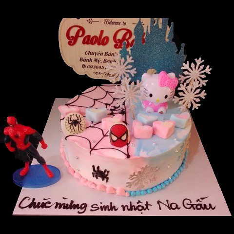 Một chiếc bánh sinh nhật cho bé gái vô cùng hường phấn với mèo Hello Kitty, lại kết hợp cùng một nửa mạnh mẽ của siêu anh hùng người Nhện. Hẳn cô bé này phải cá tính lắm đây!